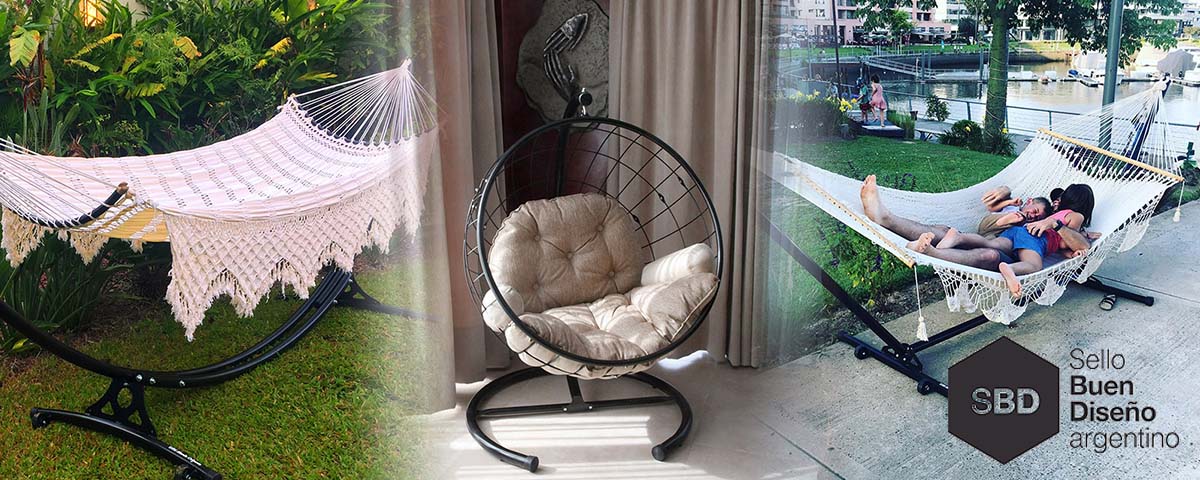 Calificado por el Sello del Buen Diseño en los soportes para hamacas paraguayas, en modelos CUARTO CRECIENTE (curvo) y RELAX (recto).